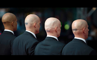 After the barber finished the reverse shaving, he took the after shave bar instead of lotion and rubbed in circular motion in my scalp and face. It gave a wonderful cool feeling at the beginning but has also burned my skin. When barber uncapped me I took my both hands and touched my bald head. Believe me!! it was so soft and it self like bare skin. I rubbed my bald head and couldn't feel any hair prickling my hands, it was that soft. I didn't feel like taking my hands from my bald head. This was same in case of all seven of us. We took lot of pictures with bald head together and returned. We didn't reveal our hairstyle or costume to anyone in the college and we want to make every one surprised. We asked two of our juniors with some artistic skills to come to our practice room. We asked them to paint the bar code in the of our head like Hitman. After painting the tattoo, we dressed in the white shirt tucked in black pants and also wore the red tie to look like Hitman.